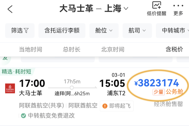 大馬士革至上海機(jī)票出現(xiàn)382萬元天價(jià)!平臺(tái)稱系供應(yīng)商失誤
